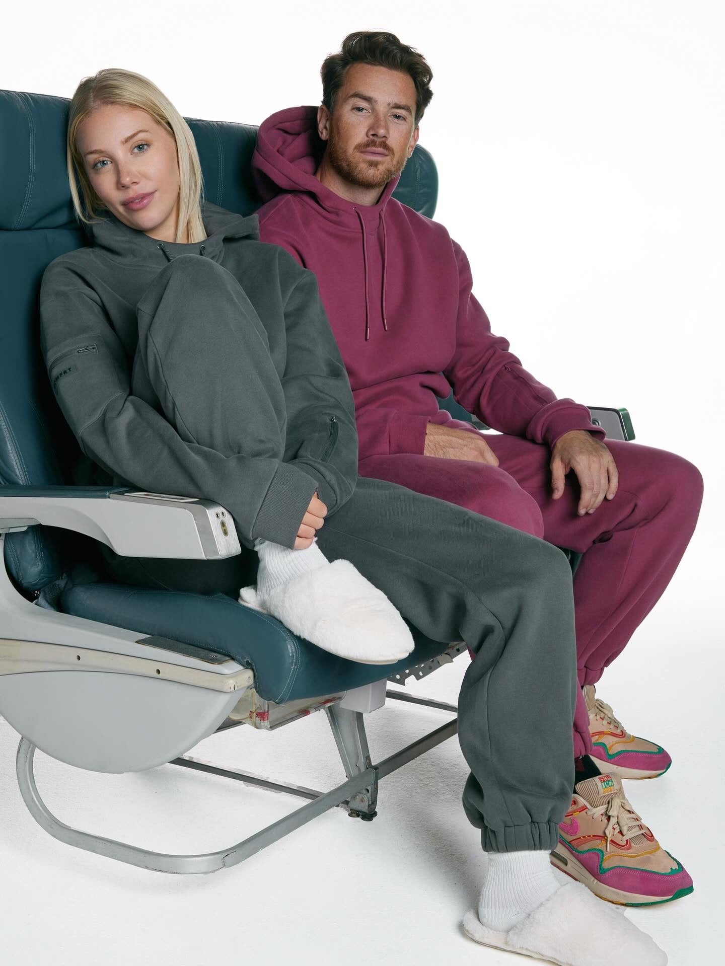Wrap yourself in Comfort and unplug with Airplane Mode. Made from our ultra-soft Combed Cotton Blend™, this hoodie is built for long flights and even longer naps. A built-in contoured eyemask lets you snooze in peace, while zip sleeve pockets keep your AirPods close. Hidden compartments inside the kangaroo pocket store your passport, ID, and cash securely. Finished with an oversized, double-lined hood for total comfort, no matter where you land.